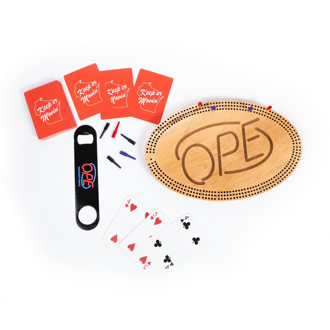 4-piece solid maple OPE Cribbage Board Set cleverly stows all you need -- Keep ‘er Movin’ Playing cards, pegs and  Da Bottle OPEner, of course!  A must for every Midwest home, cabin, boat, bar & dorm, deer stand and ice shanty. Unique and special gift idea for wedding, graduation, birthdays, retirement.  Ages 6-100!.